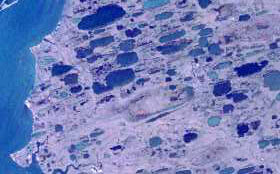 With the ground permanently frozen, water cannot seep deeper into the ground during summer. Instead, it collects at the surface and forms numerous tundra lakes. The satellite image at the right shows part of the tundra in northern Alaska. You can see the Arctic Ocean at the top of the image and a lot of lakes (blue) covering the tundra surface.